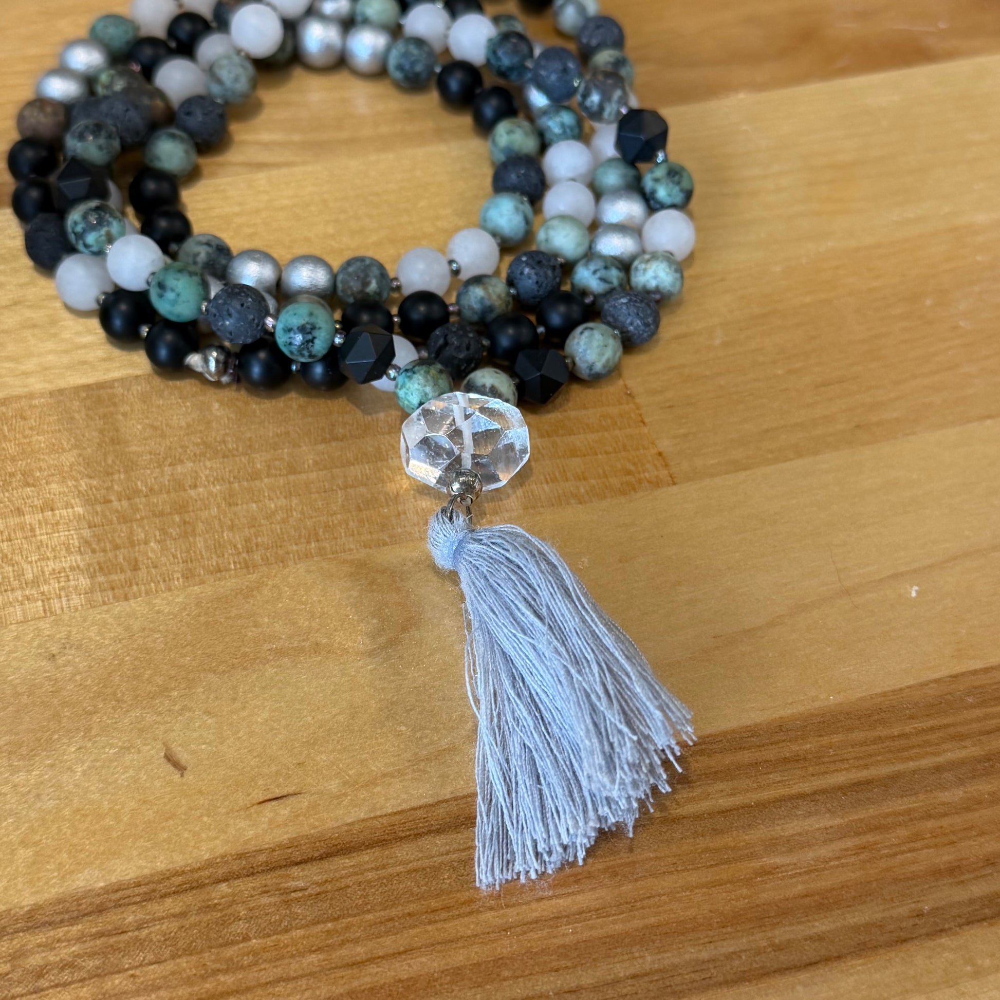 This Peruvian Turquoise, Cloudy Quartz, Onyx & Lava Stone mala necklace is designed to support protection, emotional balance, and grounded calm, a meaningful meditation tool and a bold, earthy piece you can wear every day.